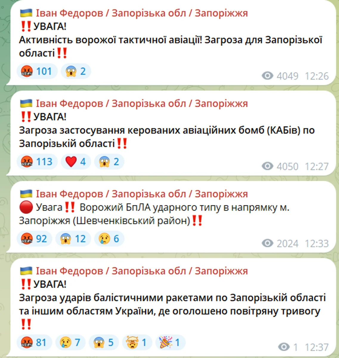 Перед взрывом руководитель ОВА предупреждал о вражеском БпЛА ударного типа, который летел в направлении Вознесеновского района Запорожья.