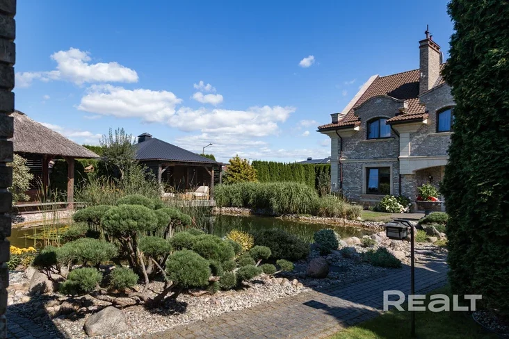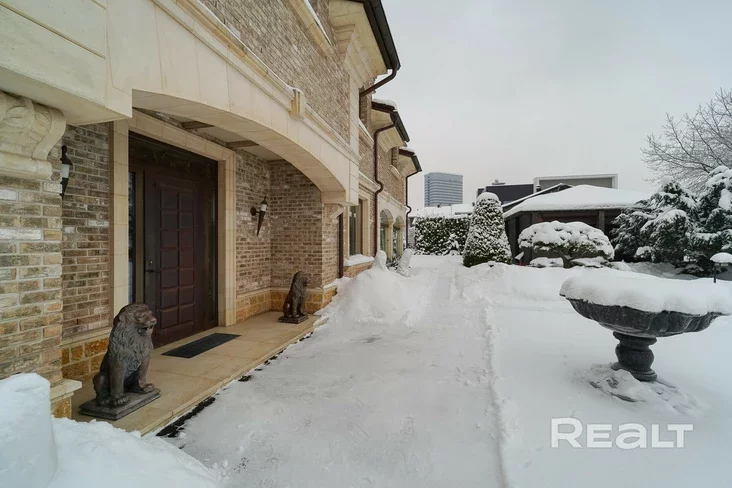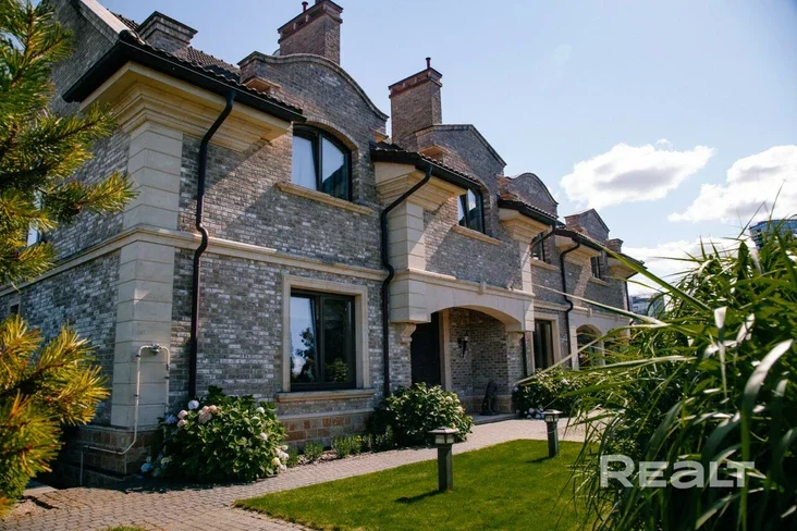 На Realt.by выставили на продажу элитный коттедж. Дом явно выделяется даже среди шикарной застройки Дроздов: симметричный фасад, ломаная линия крыши, высокие трубы.