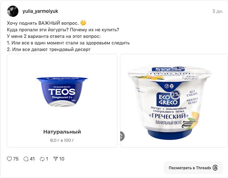 «Куда пропал греческий йогурт «Теос»? После нашумевшего тренда в инстаграм йогурт исчез с полок магазинов. Теперь его завозят реже и точечно, зачастую с какими-то вкусами, классический белый сложно найти. Мне писали про доставку и определенные адреса магазинов, но мне хочется, как раньше, покупать его без напряга в ближайшем магазине», — делятся покупатели.