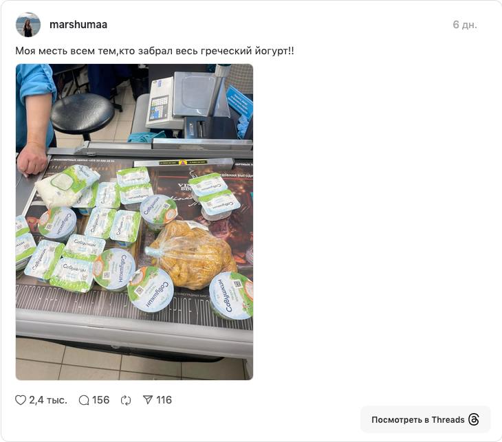 Похожая ситуация в начале 2025 года была с мягким творогом «Савушкин», за которым охотились зожники по всей стране. Усилил спрос и кулинарный тренд: тысячи и тысячи людей все еще охотятся за йогуртом, чтобы приготовить «ленивый» ПП-чизкейк, рецепт которого завирусился в интернете.