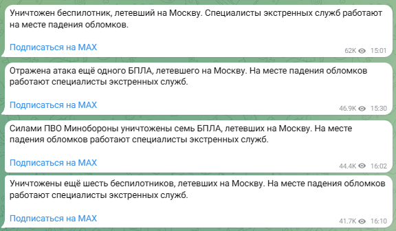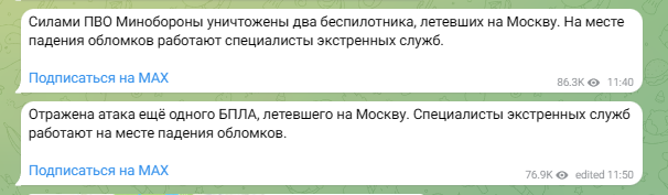 Тем временем в пабликах продолжают распространяться кадры из Москвы и Московской области, на которых атака дронов, судя по всему, продолжается.
