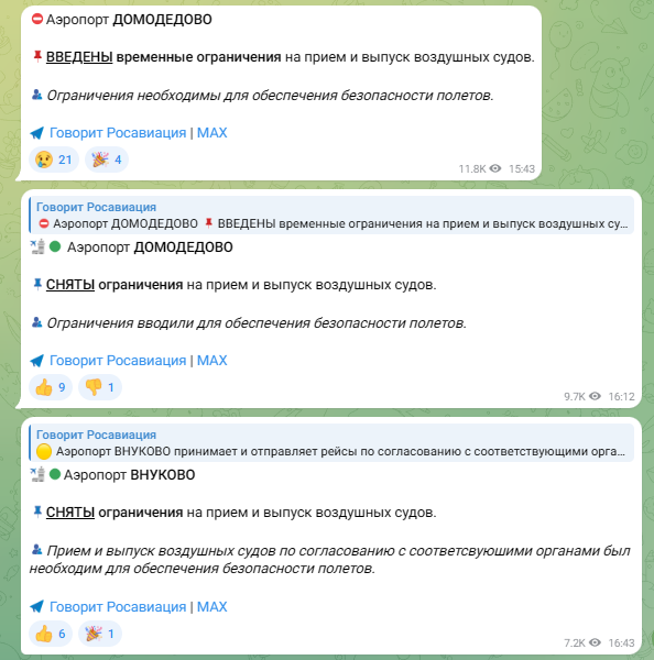 Также согласно сообщениям Росавиации, аэропорты «Домодедово» и «Внуково» временно были ограничены в работе из-за угрозы атаки беспилотников. В период примерно с 15:40 до 16:40 как минимум первый не принимал и не отправлял авиарейсы, а второй работал лишь по согласованию с соответствующими органами.