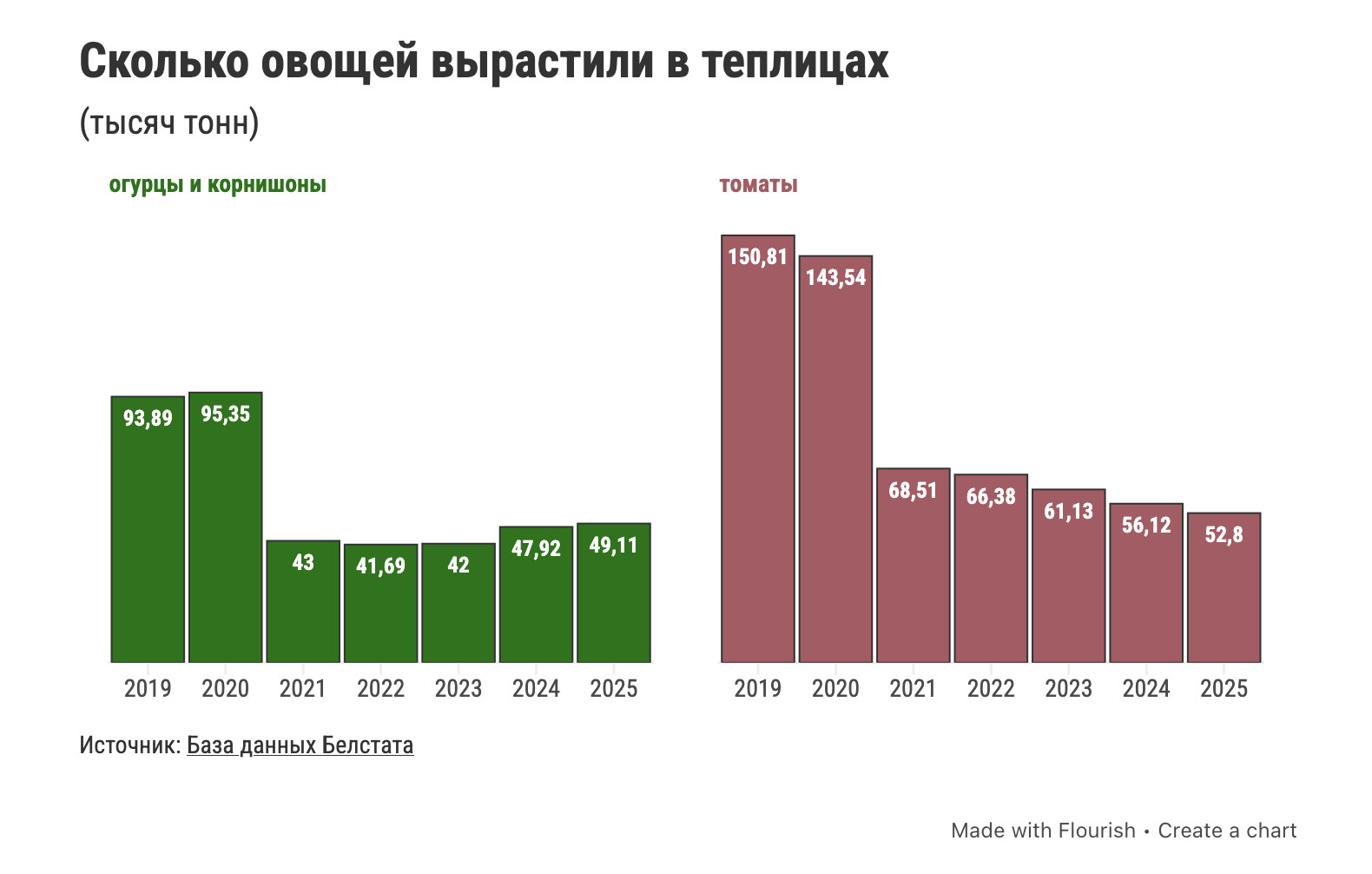 Напомним, власти несколько лет обещают практически полностью обеспечить рынок белорусскими тепличными огурцами и томатами. По данным Белстата, 90% проданных в прошлом году огурцов (не только тепличных, а в целом), были выращены местными сельхозорганизациями. Это чуть меньше, чем годом ранее. Между тем в продаже периодически возникал дефицит этого продукта.