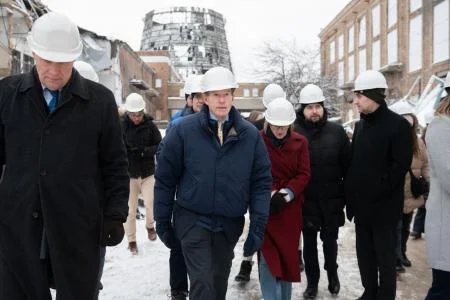 Сенаторы США Ричард Блюменталь и Шелдон Уайтхаус вместе с заместителем министра энергетики Украины Анатолием Куцеволом во вторник, 17 февраля, в Киеве посетили ТЭЦ, поврежденную в результате российских атак.