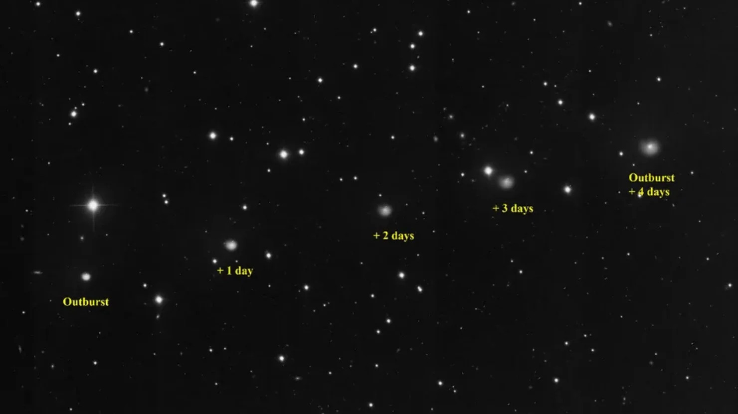Недавно у кометы 29P/Швассмана-Вахманна из-за очередного извержения увеличилась кома и она стала примерно в 100 раз ярче, чем обычно. Ученые считают, что произошло крупное извержение, которое является одним из пяти подобных масштабных событий, произошедших с кометой за последние 25 лет. Также это первое крупное извержение с октября 2024 года, когда комета 29P/Швассмана-Вахманна стала ярче примерно в 300 раз.