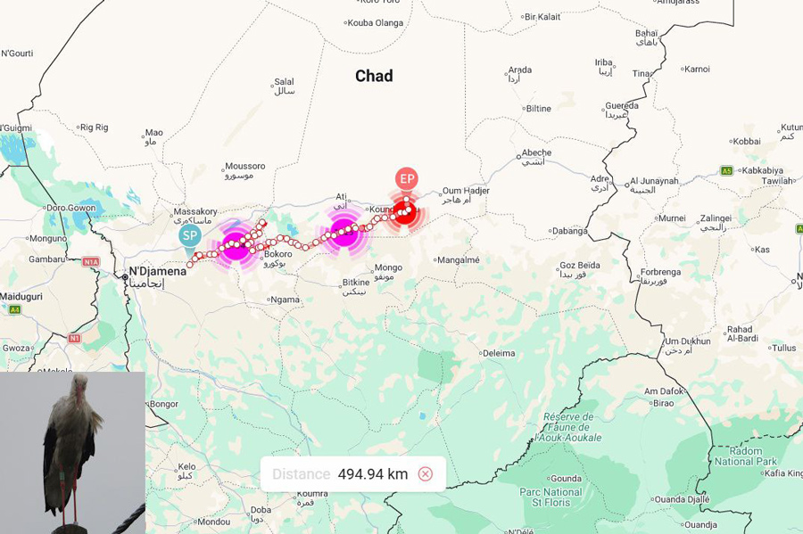 Традиционно аисты, зимующие в Чаде, летят на восток в Южный Судан, затем в Судан, чтобы попасть в долину Нила, по которой они будут следовать до самого Египта.