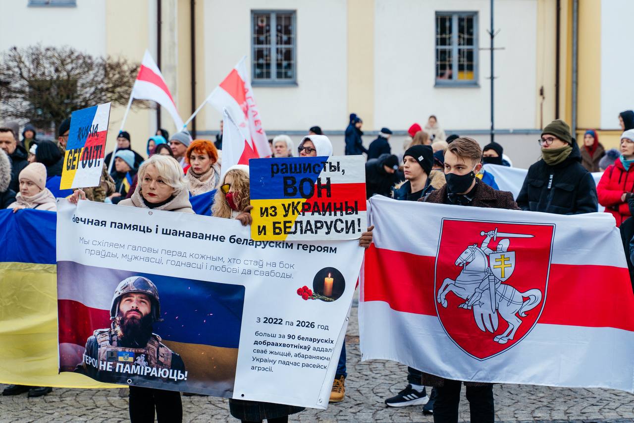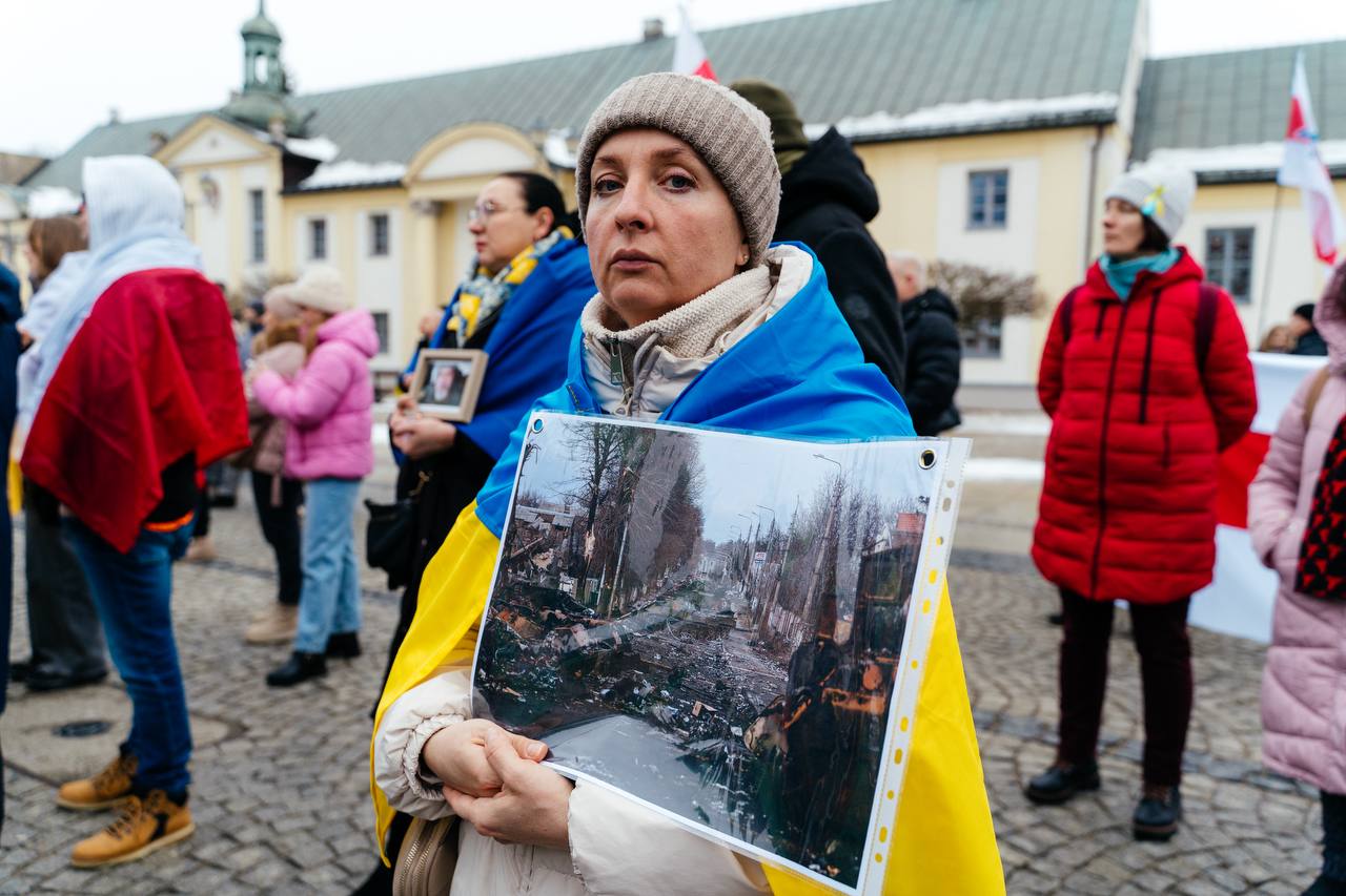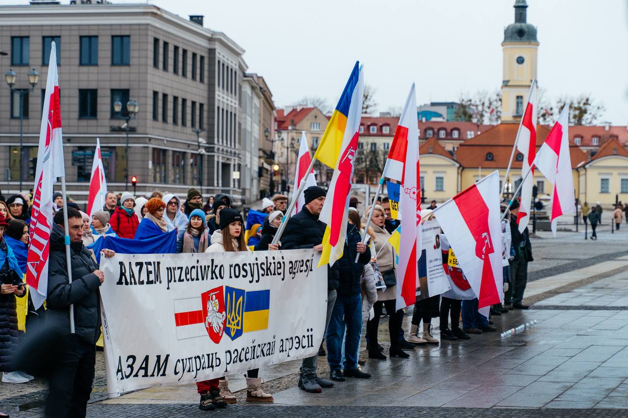 В центре Белостока около 300 украинцев, белорусов и поляков вышли на митинг, организованный диаспорой и фондом Tutaka, чтобы почтить память жертв войны и поддержать Украину, пишет Telegram-канал «Хартия-97%».