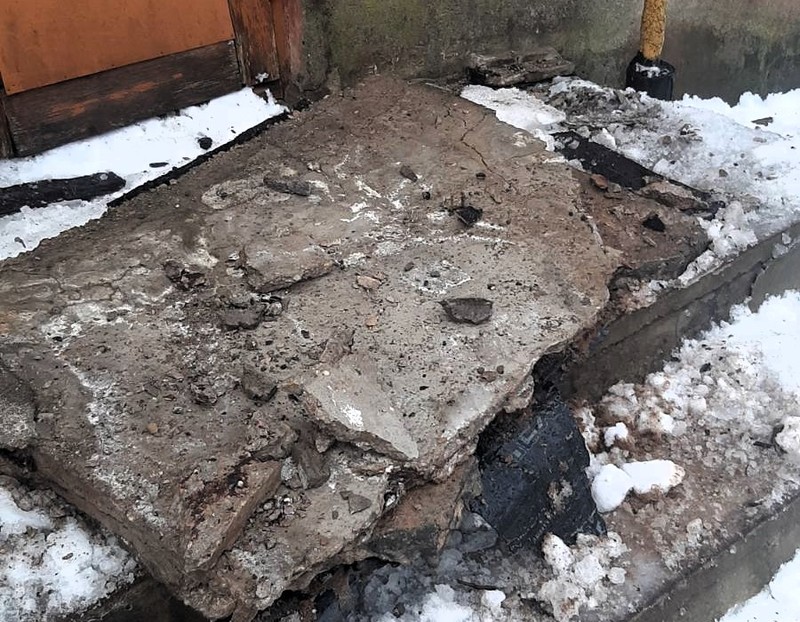Выдохнув от того, что, к счастью, не пострадали мои родные, я забеспокоилась о людях, которые живут в двух других подъездах нашего дома, поэтому с 07:00 стала звонить во все возможные коммунальные службы, в том числе в наше ЖРЭУ-3. Дозвониться оказалось непросто. Но я всё-таки добилась того, что около 09:15 приехали коммунальщики. Они посмотрели, уехали, потом приехали снова, разбили бетонную плиту козырька на куски и вывезли их на тележке.