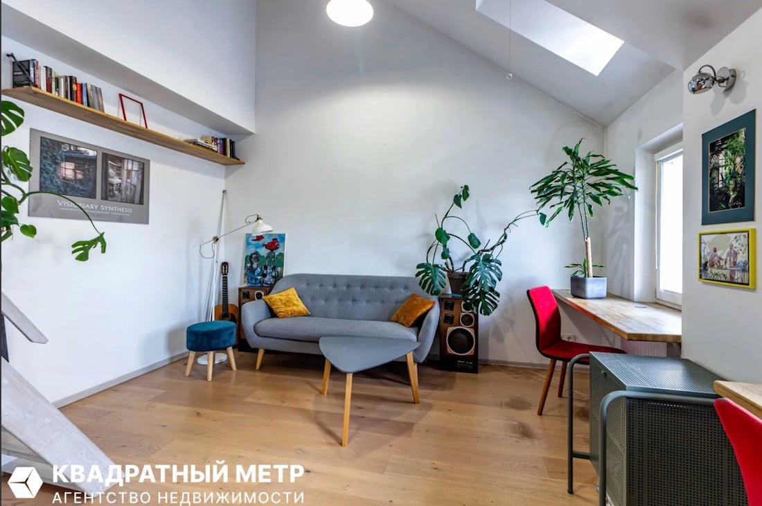 В базе сервиса «Дома и квартиры» появилась 43-метровая однушка по Червякова, 55, как раз расположенная на последнем этаже. И это, пожалуй, одна из самых необычных квартир Минска. Хозяева решили не дробить ее на комнаты и оставили «опенспейс» в виде кухни-гостиной. Одновременно с этим спальную зону (весьма компактную) вынесли на полуторный этаж. Благо высота потолков позволяет это сделать.