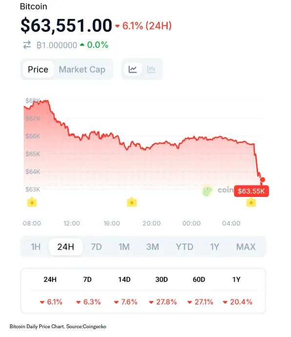 Биткоин резко упал после новости об ударе. Криптовалюта упала более чем на 6% за 24 часа, опустившись до примерно 63 300 долларов.
