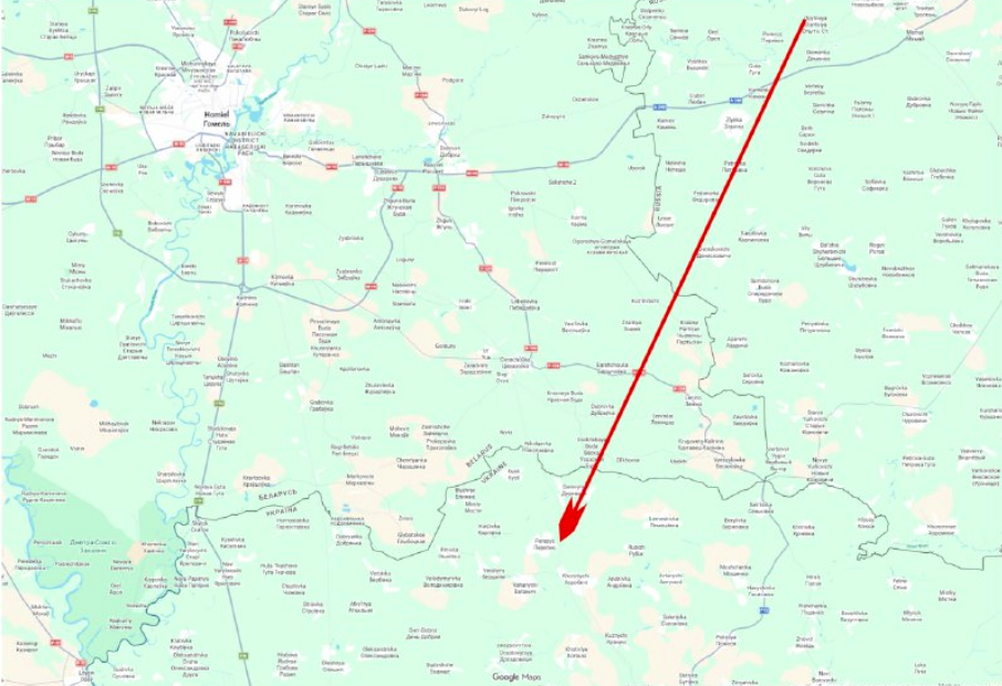 «Флагшток» уточнил информацию: одна из российских баллистических ракет пролетела над Гомельским районом ночью 3 января около 02:40. Траектория движения на иллюстрации.