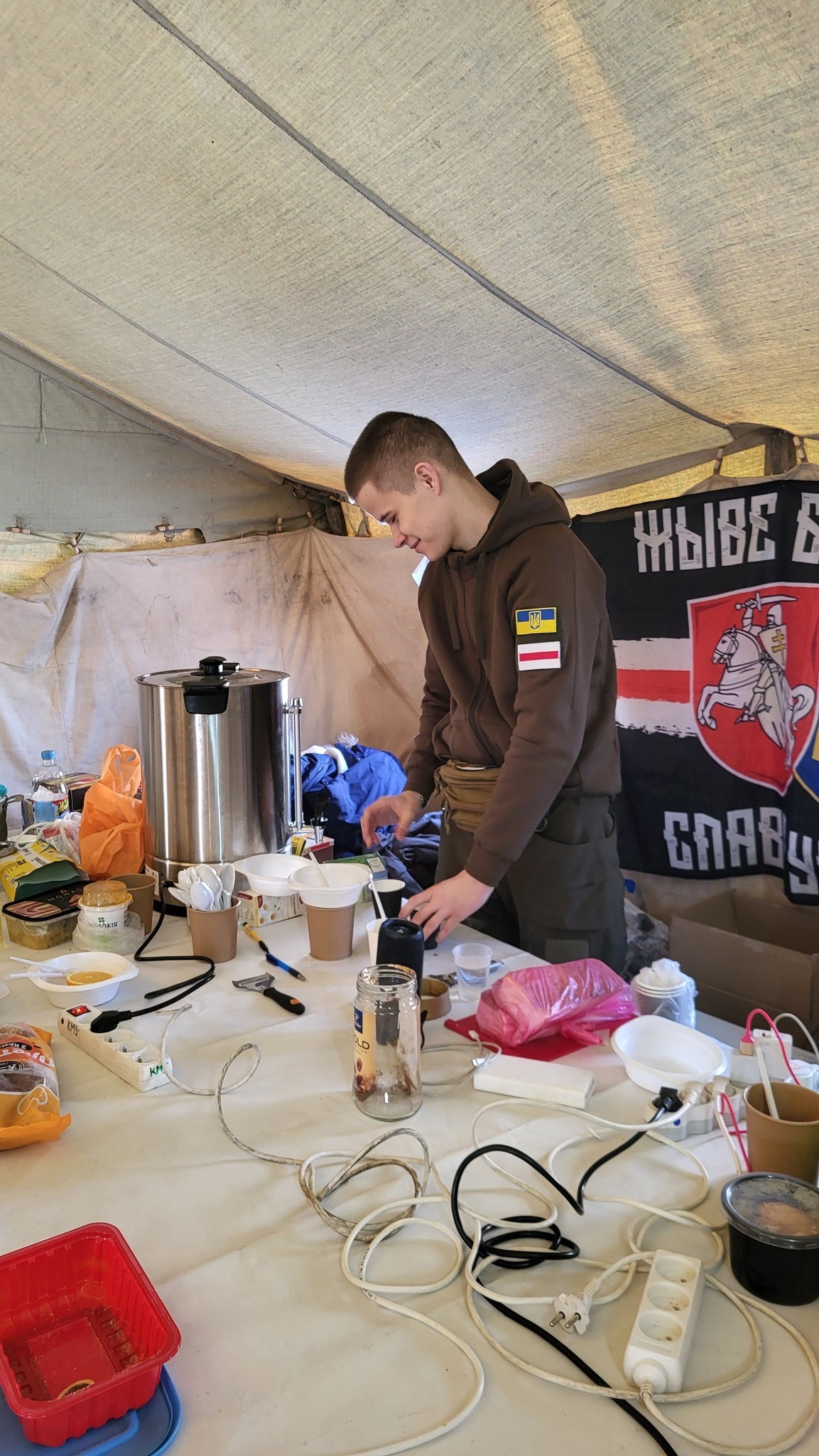 В первый же вечер, когда мы только устанавливали палатку, у нас еще почти ничего не было. Мы включили генератор и начали все подключать. Уже тогда к нам пришли, я думаю, человек 50 или больше — просто чтобы зарядить телефоны. Мы не успевали раздавать удлинители. В тот момент здесь не было ни света, ни воды — вообще ничего. Пункт начал работать еще до того, как мы все успели окончательно подготовить.