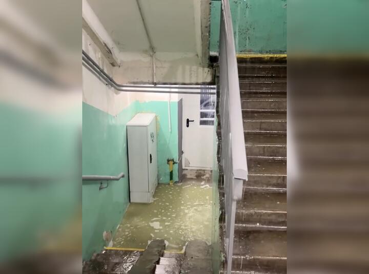 В опубликованном ролике видно, как одна из лестничных площадок дома полностью залита водой — пройти там невозможно. В то же время с пролетов, расположенных выше, и с перекрытий на потолке вода течет струей — даже не капает.
