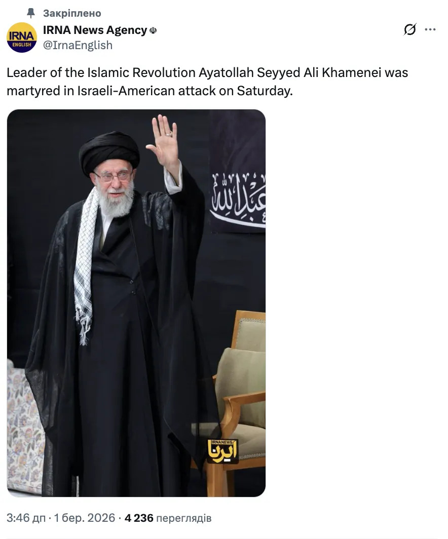 Об этом пишет IRNA. «Аятолла Хаменеи, верховный лидер Ирана, погиб мученической смертью в результате нападения сионистского режима и Соединенных Штатов в субботу утром», – сказано в сообщении.