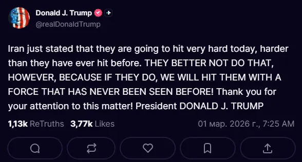 Также президент США пригрозил своим ответным ударом, если Иран надумает атаковать. Об этом Трамп заявил в социальной сети Truth Social.