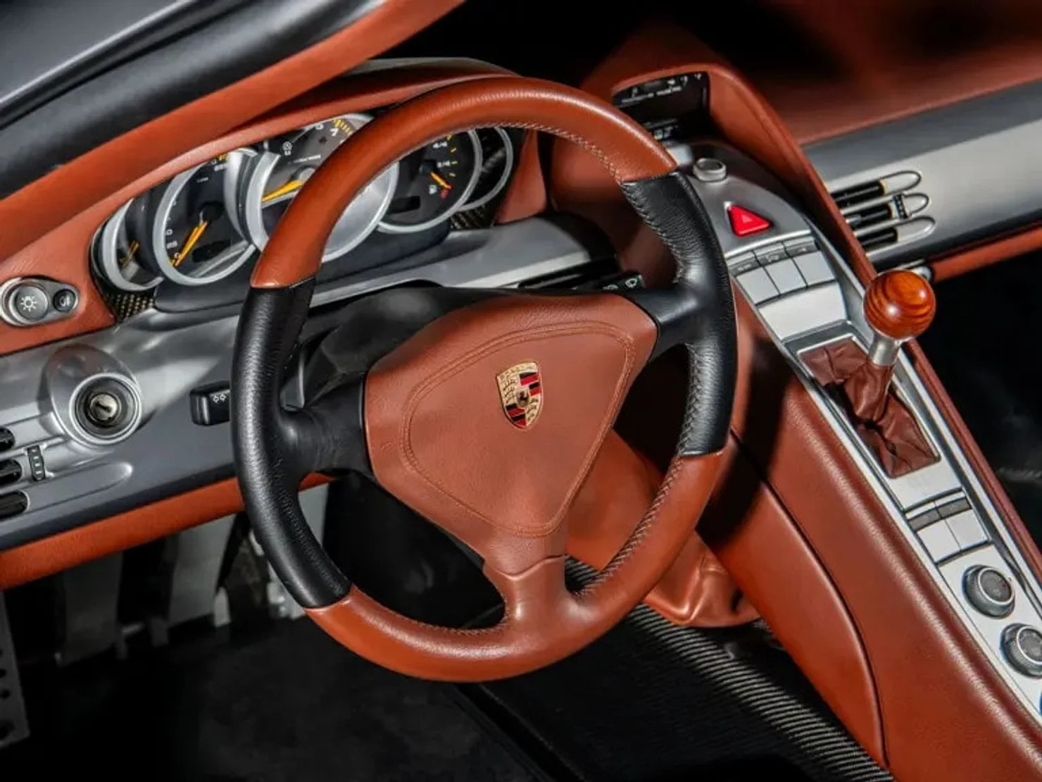Этот Porsche Carrera GT имеет кофейный кожаный салон, а также оснащен кондиционером, акустикой Bose с CD-плеером и набором фирменного багажа.