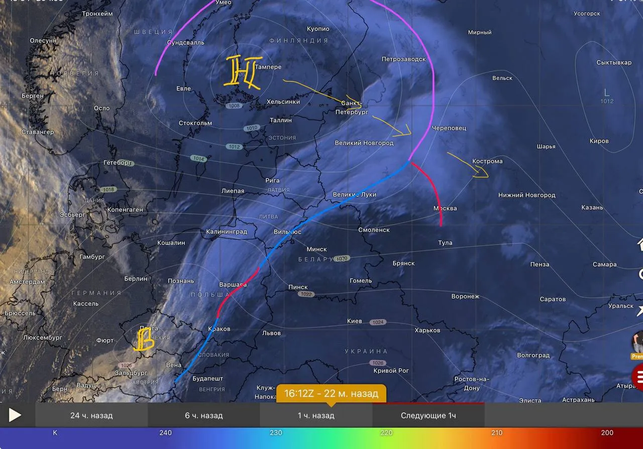 К западным границам Беларуси подошел, как видно со спутника, размытый холодный фронт циклона, центр которого «Н» сейчас над Финляндией. Фронт в течение ночи продолжит двигаться на восток, вглубь нашей страны, однако, кроме увеличения облачности он ничего с собой не принесет.