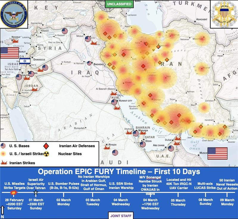 17.40 Центральное командование США опубликовало карту ударов по Ирану, нанесенных в первые 10 дней операции «Эпическая ярость».