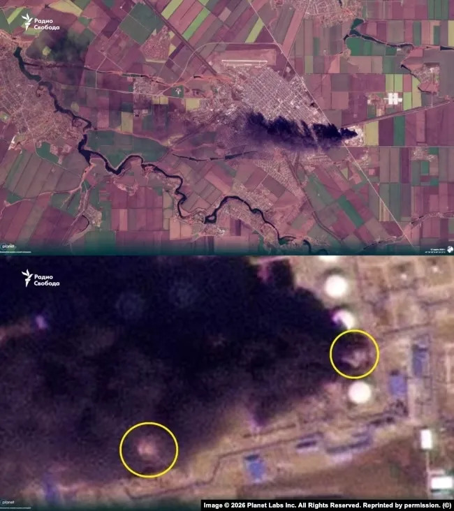 Об этом сообщает местная власть. В свою очередь российская служба «Радио Свобода» предоставила спутниковые снимки, которые позволяют увидеть, что на территории перевалочной базы в городе после удара дронов горят два резервуара с топливом, а не один, как считалось ранее.