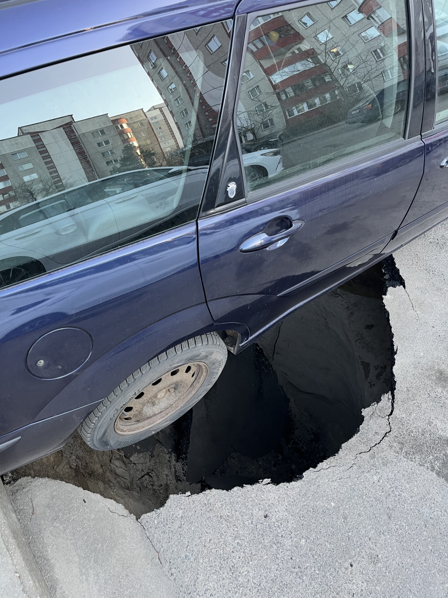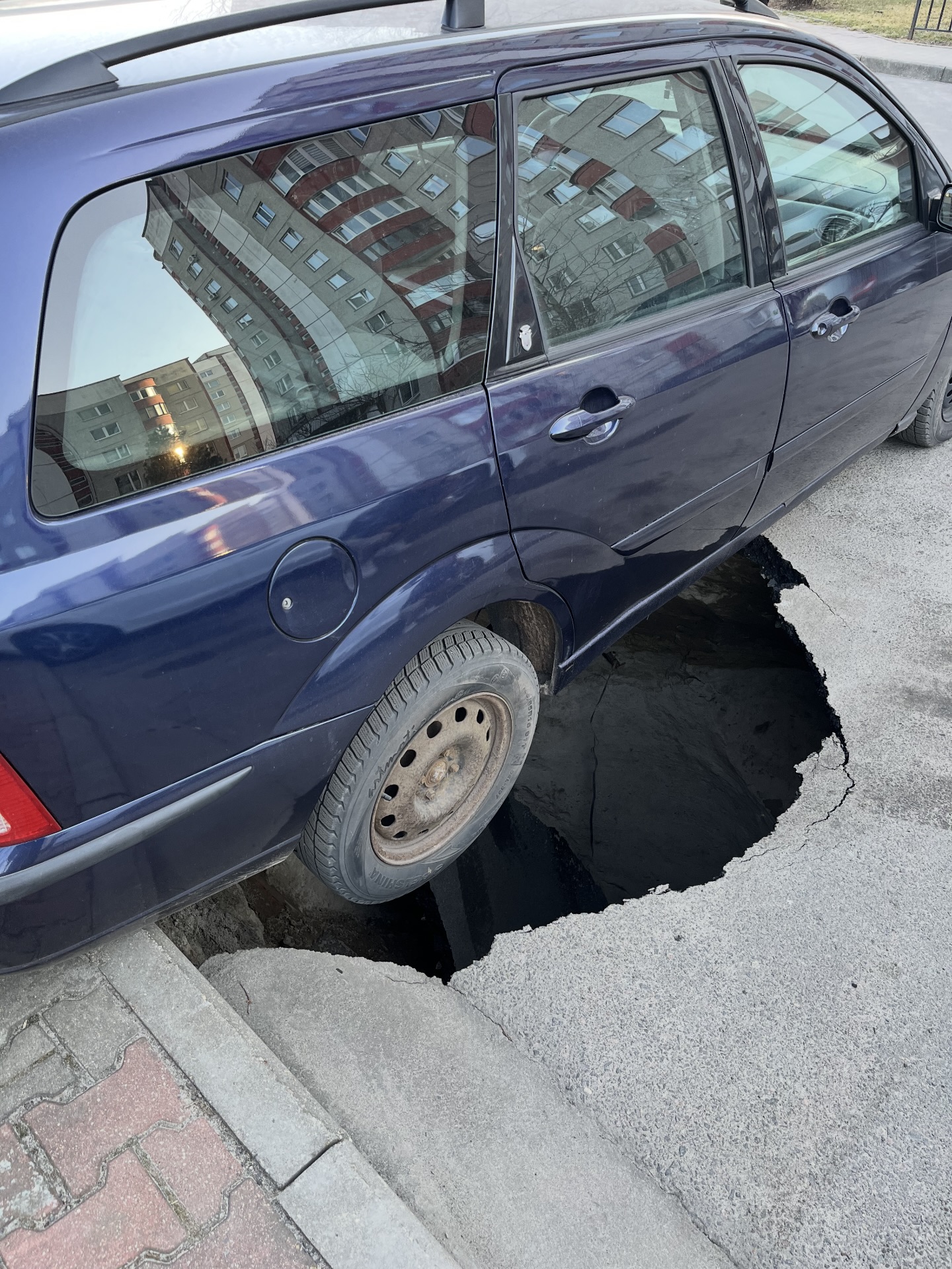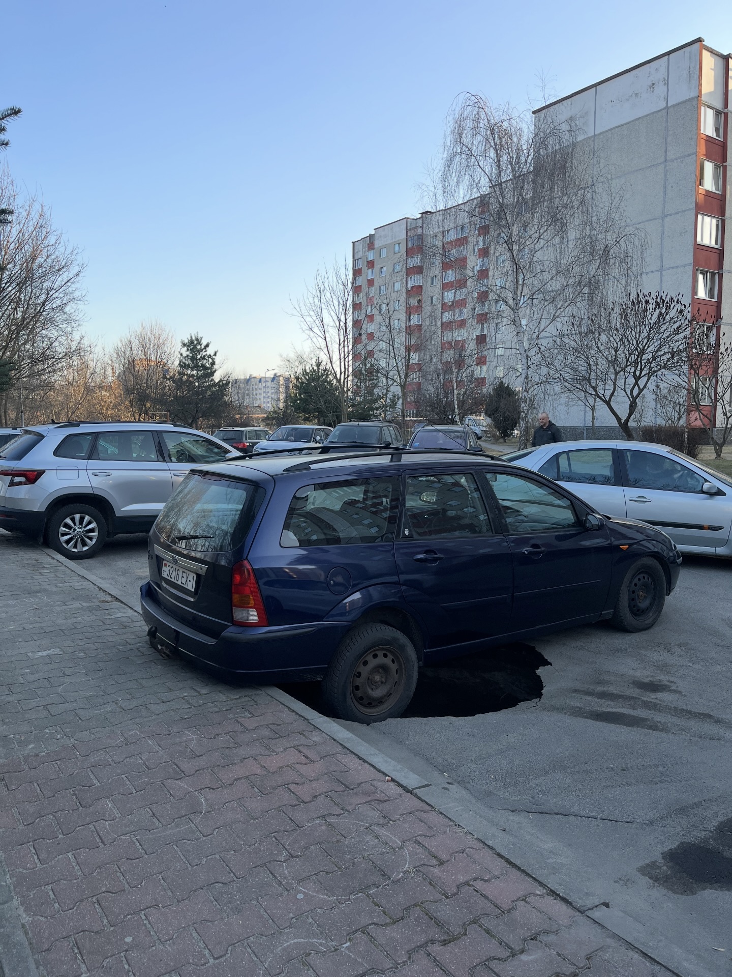 «Недоброе утро сегодня в одном из вульковских дворов. Трёхметровая яма, глубина — четыре метра. Старенький «Форд» висит на фаркопе. Уже, кстати, не первый раз там такое», — написал Терехов, прикрепив фото с места происшествия.
