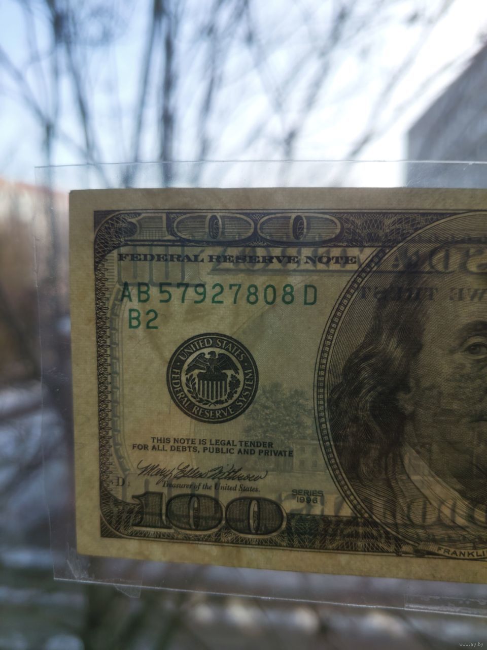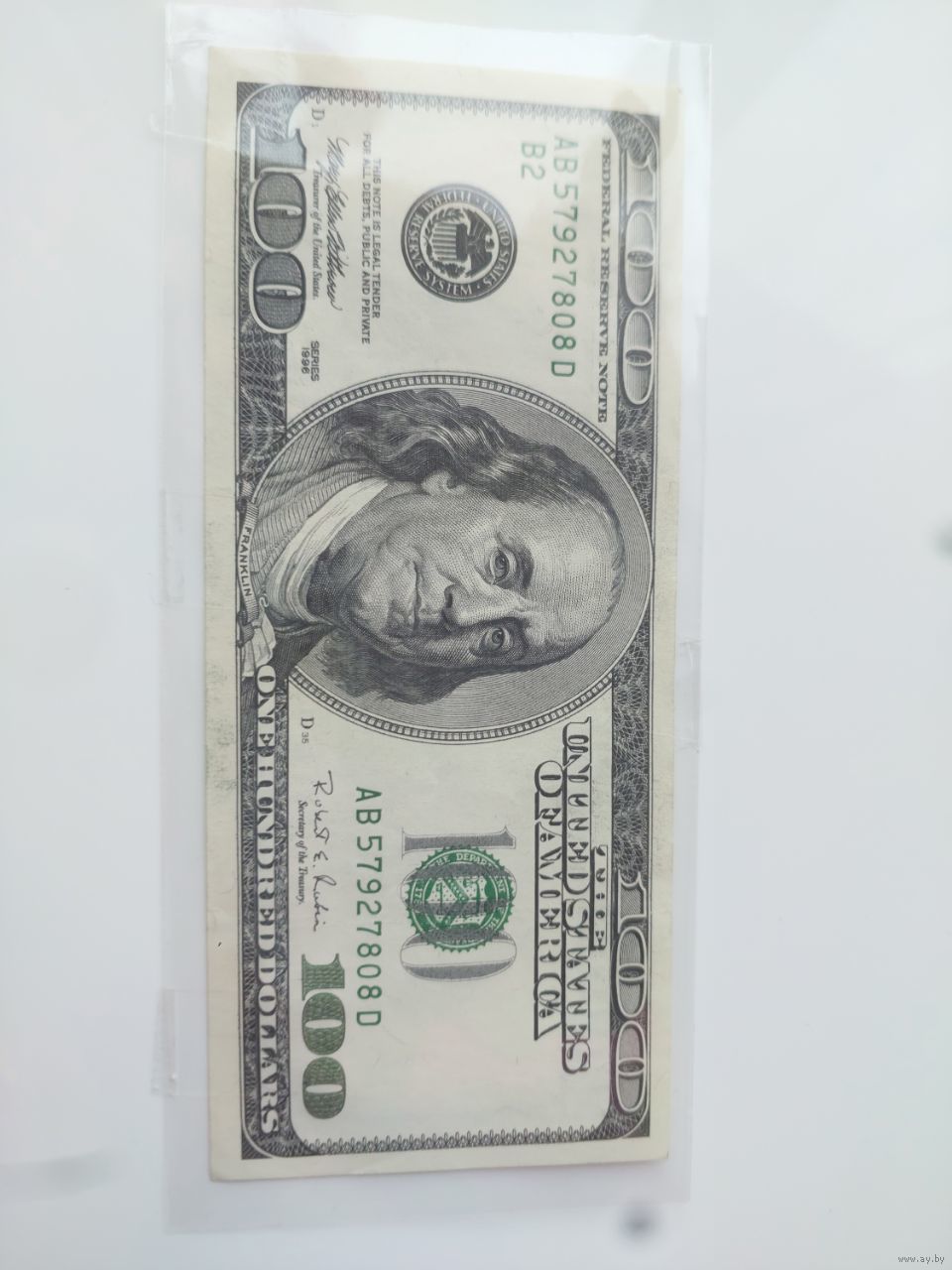 Как указано в описании лота, банкнота 1996 года находится в «очень хорошем» состоянии. Особенность купюры — неправильно расположенный водяной знак: если посмотреть на просвет, портрет Бенджамина Франклина виден в углу и перевернут. По правилам он должен находиться справа от основного изображения и быть размещён в том же положении.