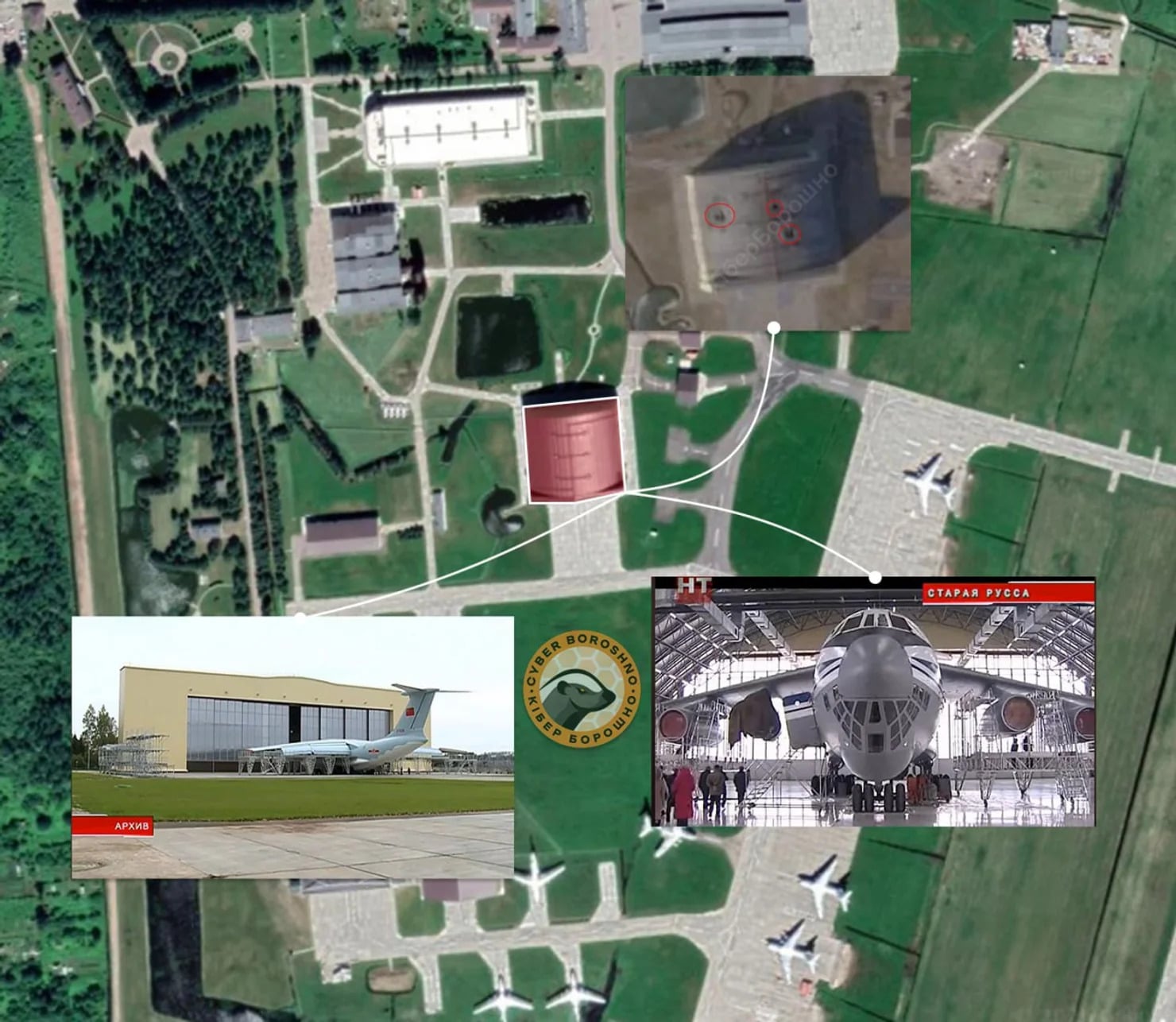 На фото OSINTеров — высококачественный спутниковый кадр, который ясно показывает три сквозных отверстия на крыше сооружения. Геолокация и привязка к фото из открытых источников продемонстрировала, что речь идет об ангаре, в котором занимаются Ил-76. Ориентировочные точки попадания имеют координаты 57.96943, 31.378.