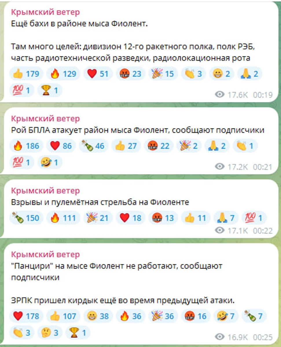 Хотя официального подтверждения атаки на объект на момент публикации нет, другой OSINT-канал «Крымский ветер» также пишет о налете беспилотников на оккупированный Крым. По данным аналитиков, в районе мыса Фиолент размещены многие военные цели, в том числе дивизион 12-го ракетного полка, полк РЭБ, часть радиотехнической разведки и радиолокационная рота.