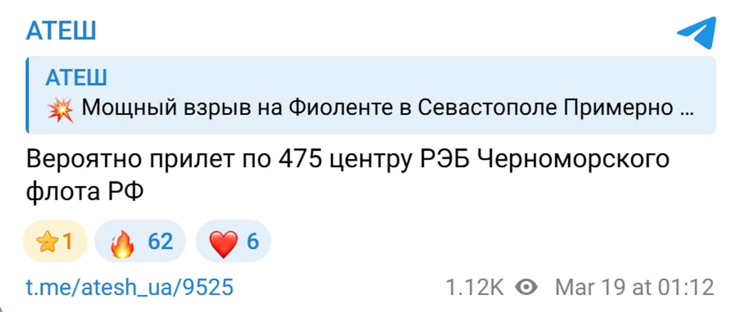 «Мощный взрыв на Фиоленте в Севастополе... Вероятно, «прилет» по 475 центру РЭБ Черноморского флота РФ», — говорится в сообщении партизан.
