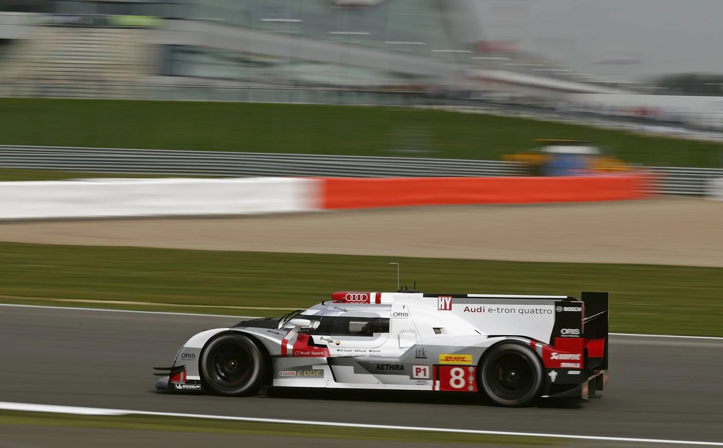Особенность Audi R18 e-tron — ее нетипичная гибридная установка с 4,0-литровым турбодизельным V6 мощностью 558 л.с., который приводит задние колеса, и 272-сильным электромотором на передней оси. Суммарная отдача превышает 700 сил.