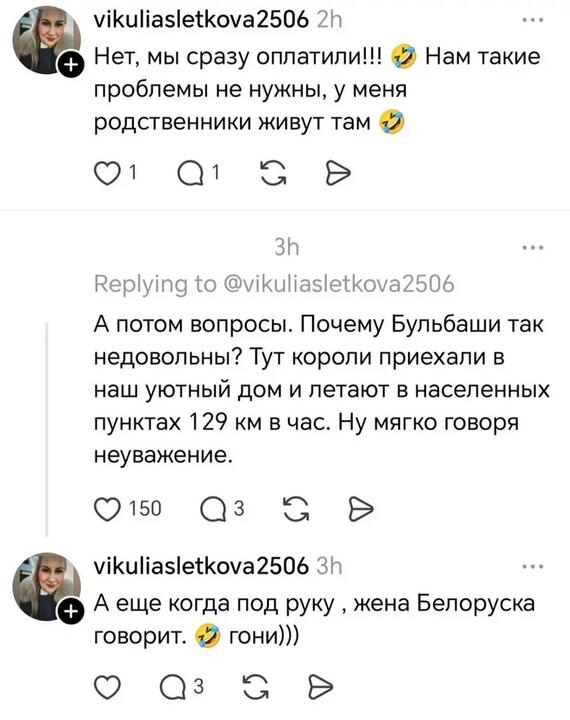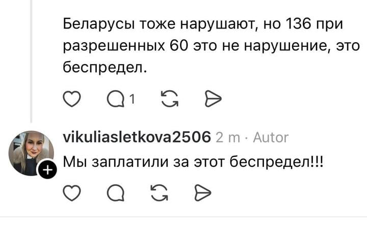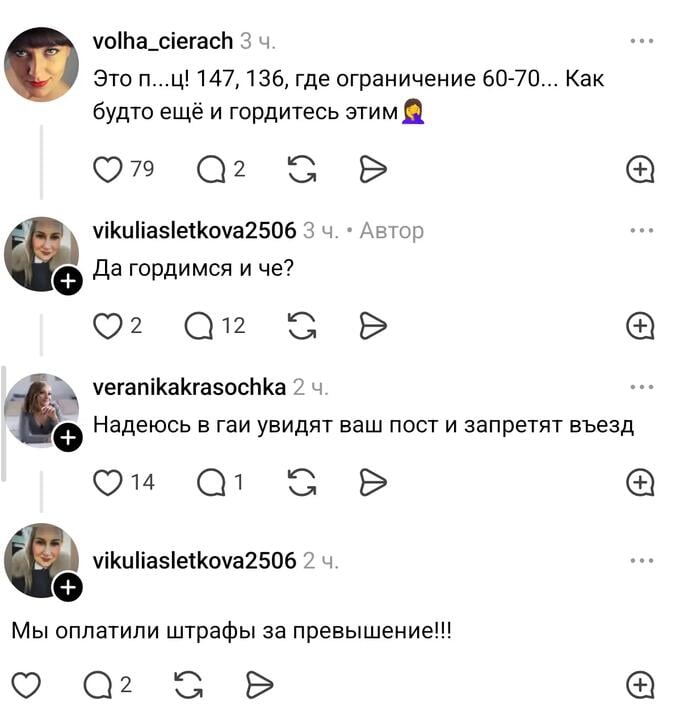 Несмотря на то, что в Threads на женщину подписано всего 47 человек, ее пост (она его уже удалила) быстро стал вирусным. В комментариях люди начали обсуждать поведение Виктории и ее супруга и возмущаться. В ответ она не стала молчать. Скриншоты ее сообщений сохранились в ветках других пользователей. Например, когда кто-то из участников беседы написал: «Беларусы тоже нарушают, но 136 км/ч при разрешенных 60 — это не нарушение, это беспредел».