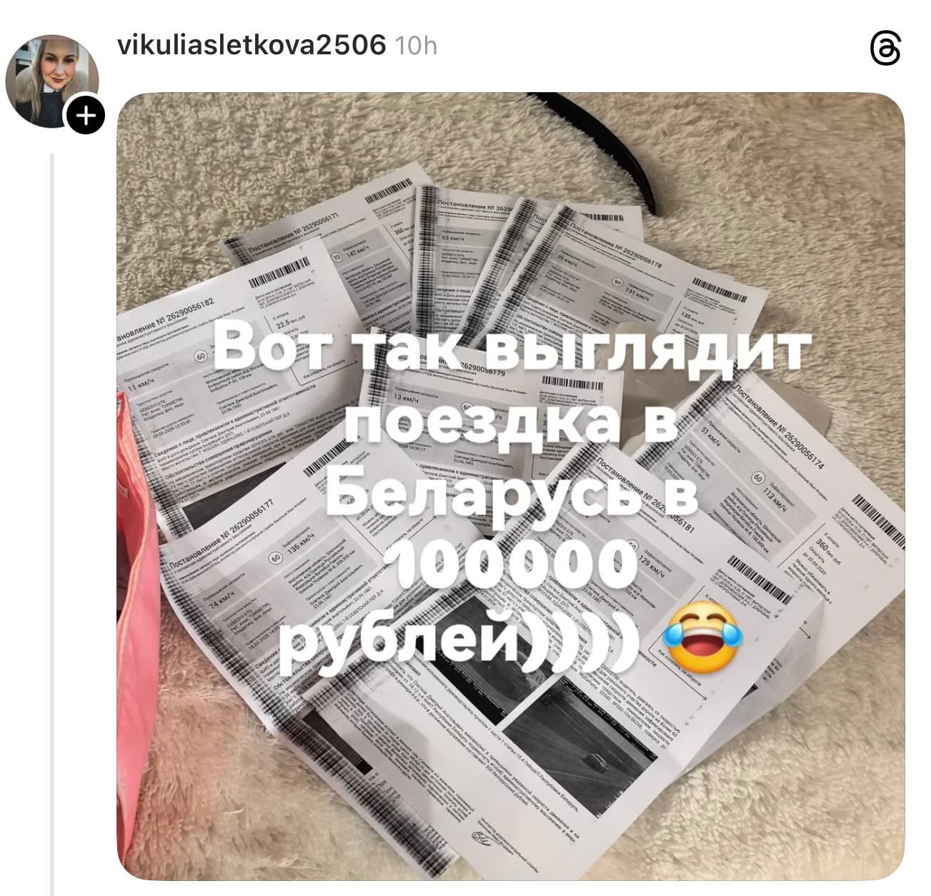 На днях пользовательница Threads Виктория Слеткова похвасталась в своем аккаунте тем, как они с мужем съездили в Беларусь. Женщина выложила фото, на котором несколько квитанций со штрафами. Судя по ним, за превышение скорости на дорогах семье насчитали более 3,6 тысяч рублей. В соцсетях это вызвало волну возмущения. Виктория молчать тоже не стала, пишет «Зеркало».