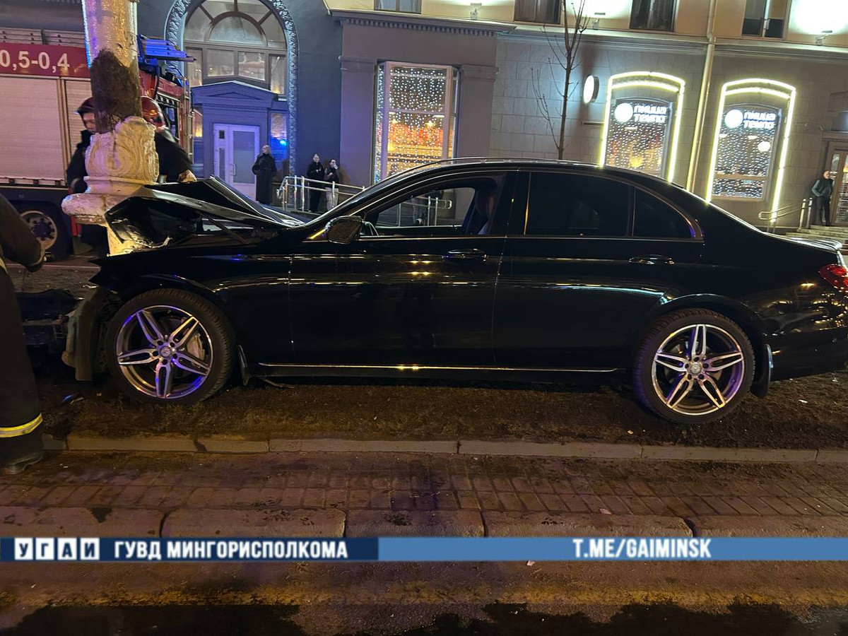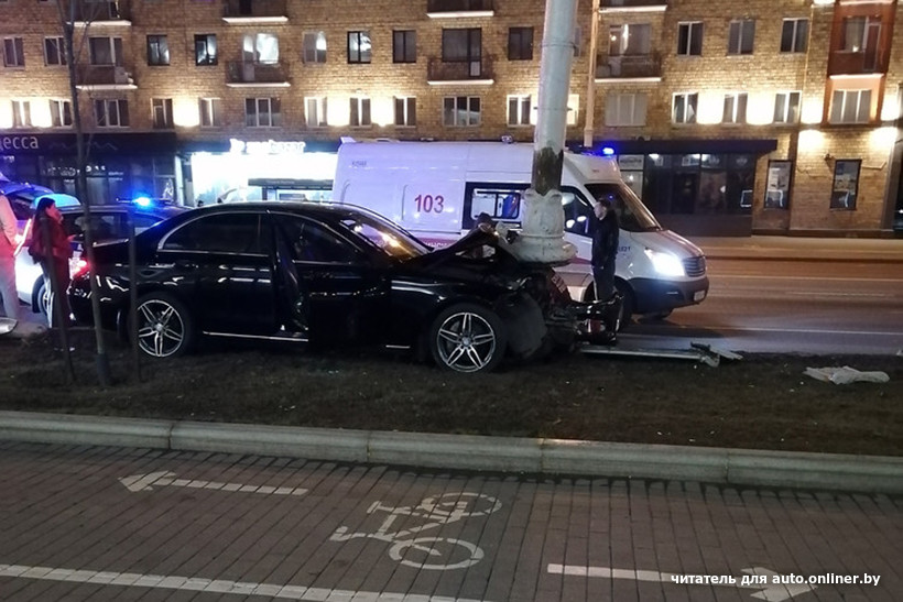 Видеофакт: в Минске Mercedes врезался в столб на проспекте Независимости
