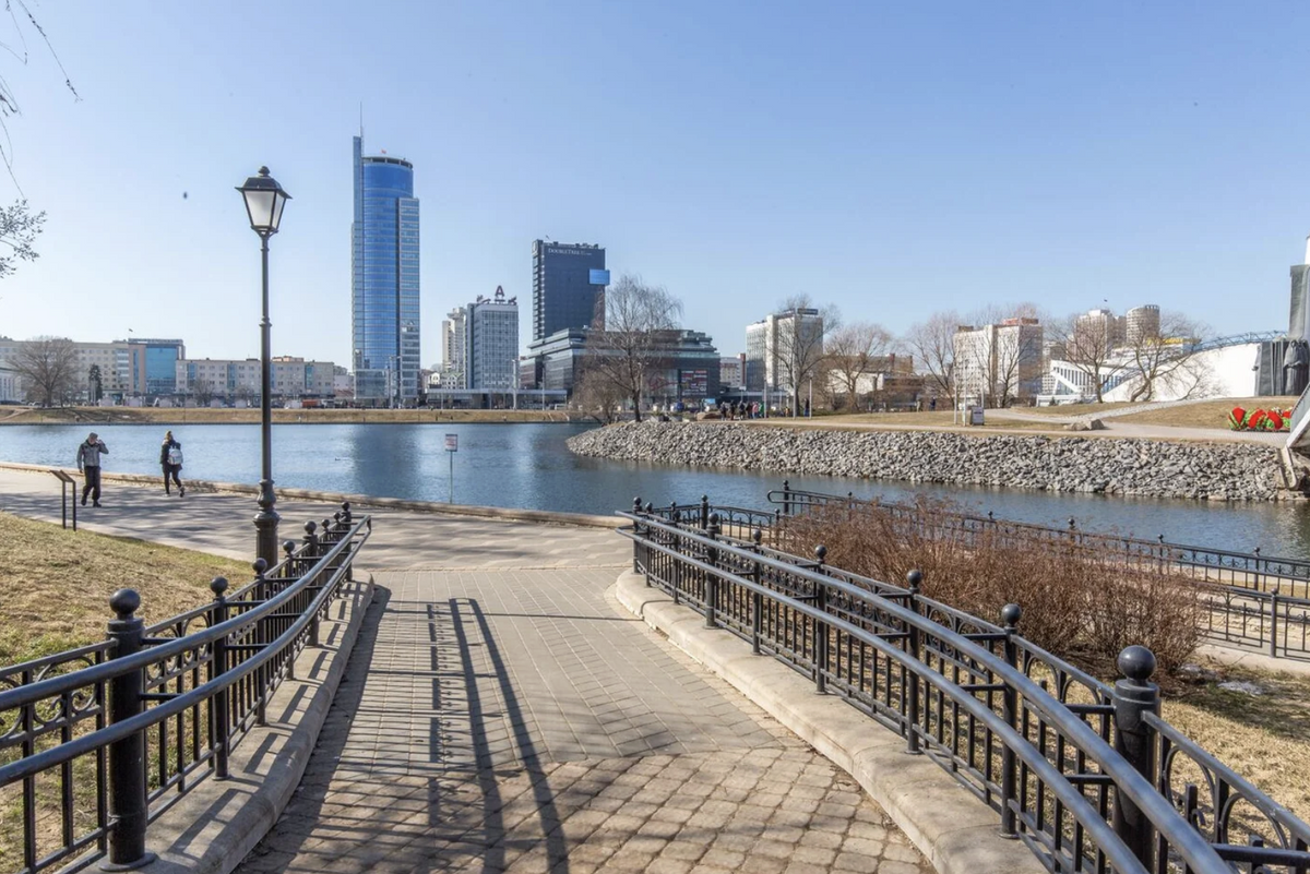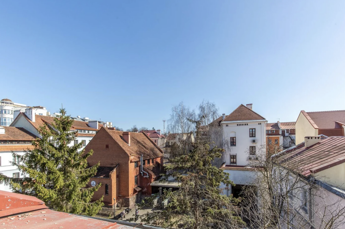 Один из самых ценных критериев при выборе квартиры в центре города — это живописный вид. В данном случае дом расположен на берегу, но окна выходят на другую сторону. Гладь Свислочи отсюда не видна, но крыши «игрушечных» домов тоже смотрятся очень интересно.