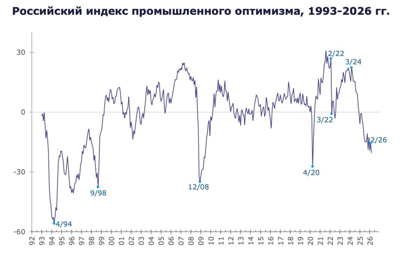 За три с лишним десятилетия, что в России проводится опрос, значение индекса опускалось ниже лишь трижды: на пике пандемии в 2020 году, во время глобального финансового кризиса 2008-го, а также в 1990-х годах, когда в экономике царил хаос после развала СССР, передает The Moscow Times.