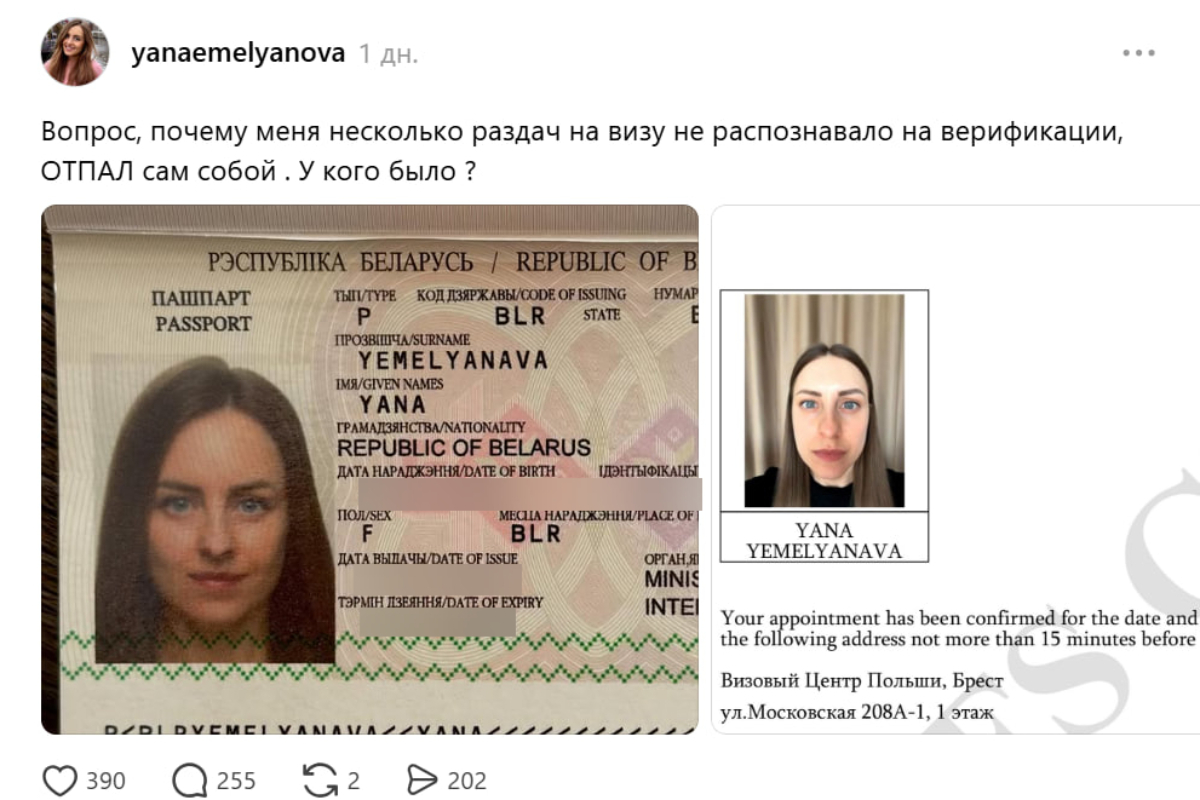 На днях пользовательница Threads Яна сообщила о проблеме, с которой столкнулась при регистрации на польскую визу. Система не распознает ее селфи, которое сама же делает. В итоге девушка не могла поймать «окошко» для записи. Об этом белоруска рассказала в своем аккаунте. Оказалось, такие сложности не только у нее, пишет «Зеркало».