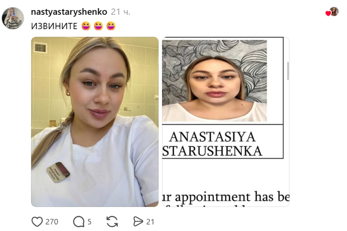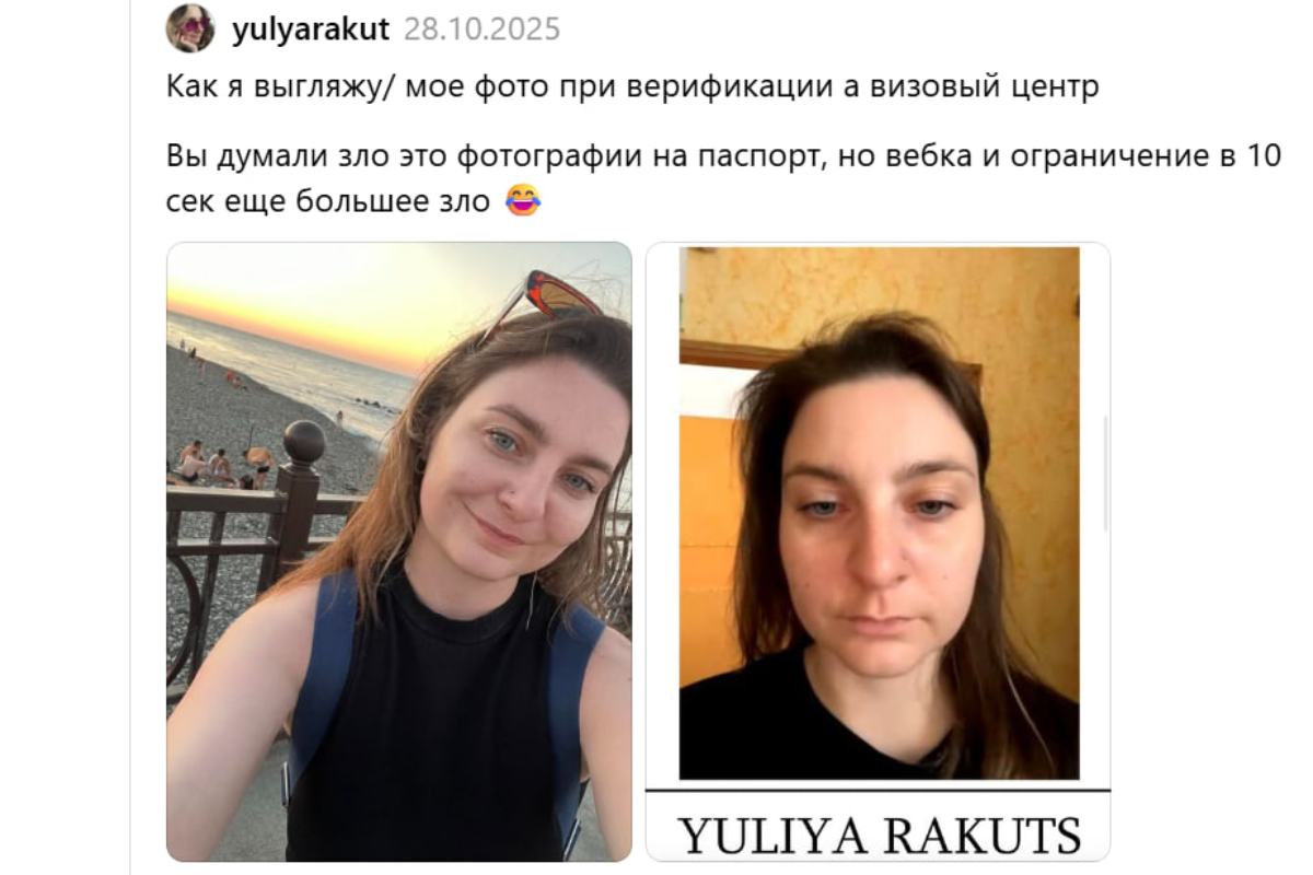 — Вопрос, почему меня несколько раздач на визу не распознавало на верификации, отпал сам собой, — иронично написала девушка в Threads, приложив снимок с верификационного фото и страничку из паспорта.