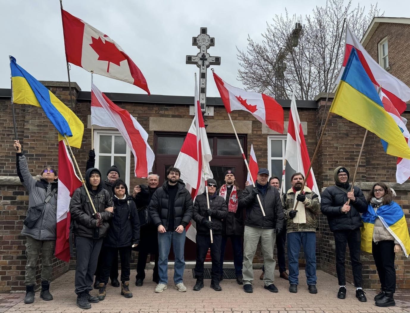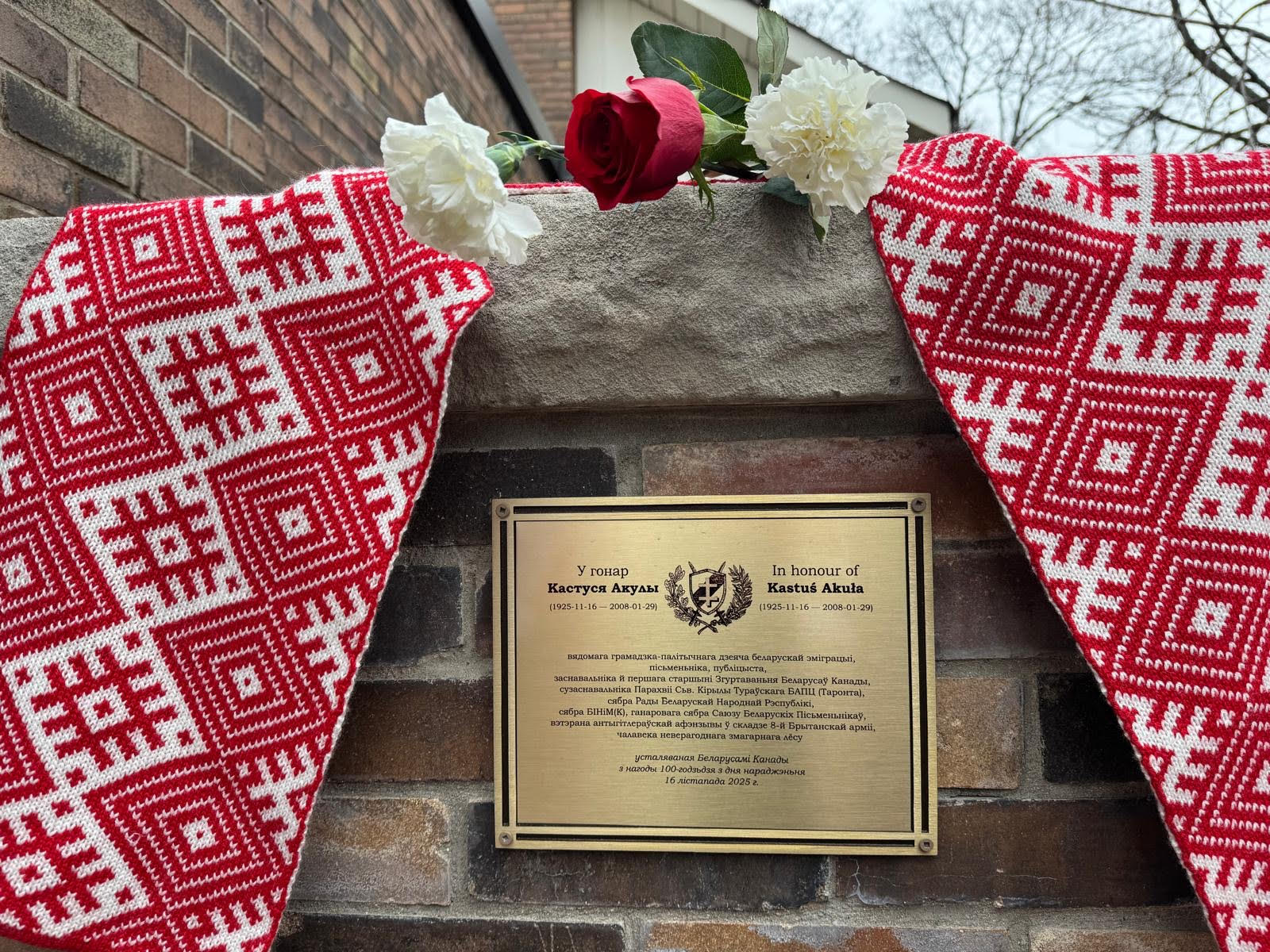 Придя к зданию Белорусского центра, участники шествия возложили бело‑красно‑белые цветы к мемориальной доске в честь Кастуся Акулы, торжественно открытой 16 ноября 2025 года по случаю его столетия. Были произнесены слова благодарности нашему знаменитому соотечественнику, стоявшему у истоков организованной белорусской жизни в Канаде.