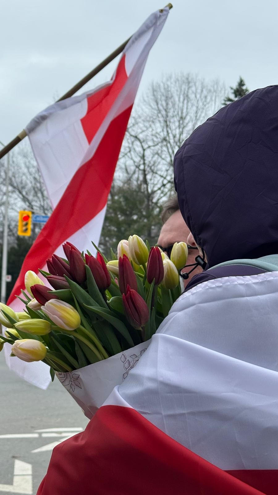 Затем участники митинга двинулись к Белорусскому центру. Люди несли бело‑красно‑белые флаги, а также флаги Канады и Украины.