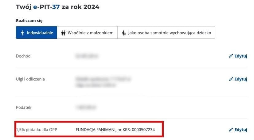 В поле «Numer KRS wybranej organizacji (Poz. 147 z PIT-37)» введите номер 0000507234. Это номер FaniMani — партнерской организации, которая поможет нам получить помощь.
