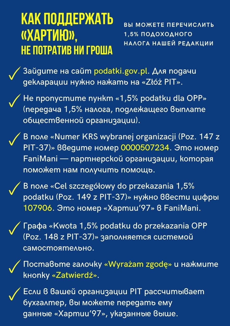 Дорогие друзья! Если вы живете в Польше и считаете, что мы делаем важную работу, у вас есть простая возможность поддержать «Хартию’97».