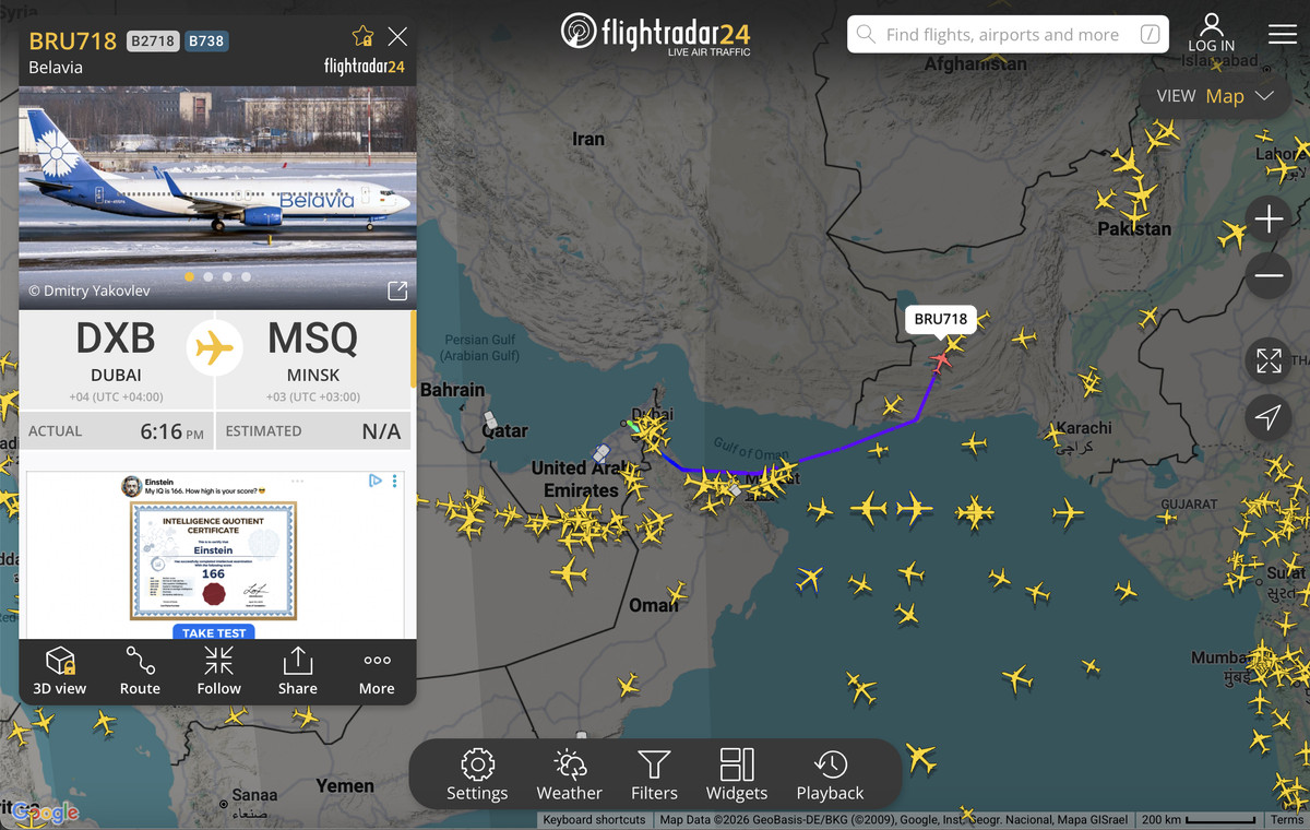 Судя по табло аэропорта Дубая, рейс вылетел из ОАЭ в 17:16 по минскому времени. Дальше шел крюком — через Пакистан, Афганистан и Туркменистан.