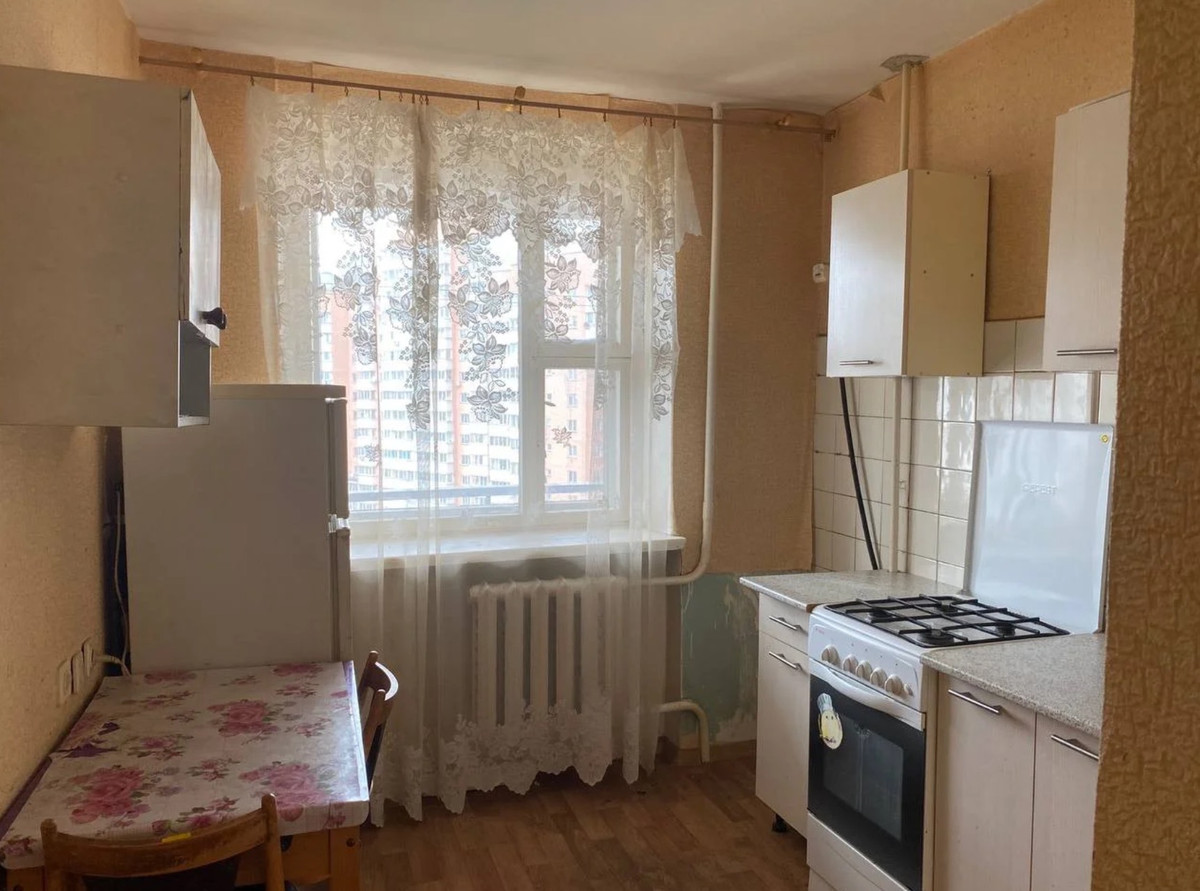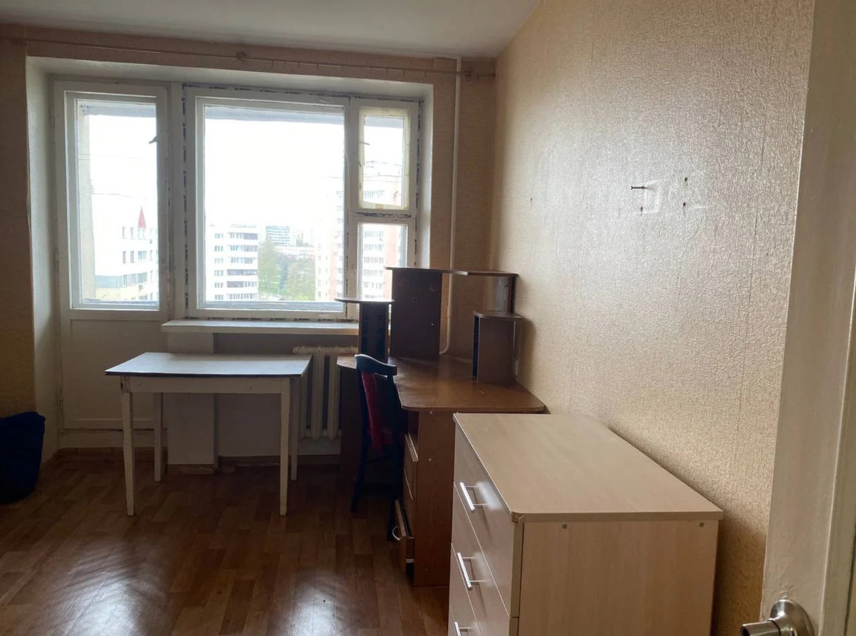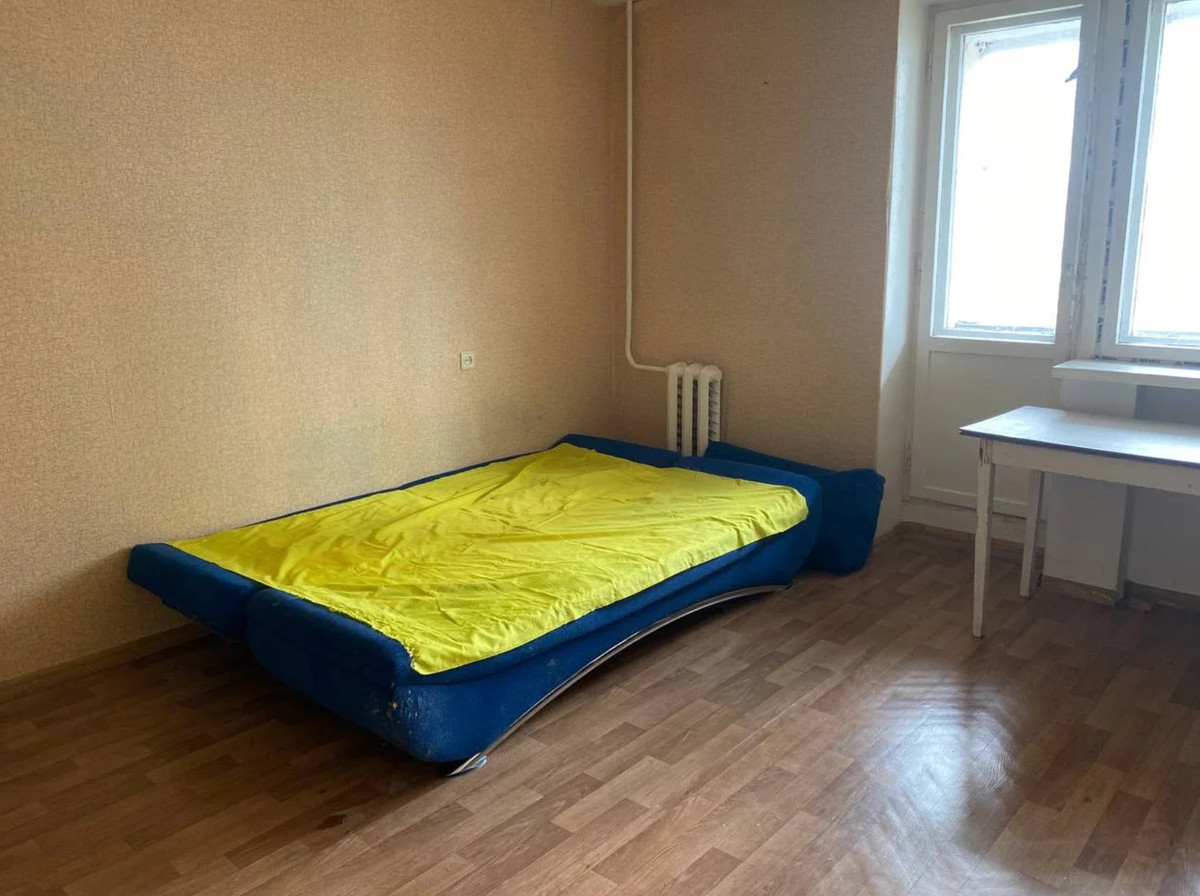 Жилье находится на Логойском тракте, в приличного вида девятиэтажке. Внутри — обычная обстановка из 1990-х: старые обои, линолеум, простая мебель. При этом жилье нельзя назвать совсем пустым: в комнате есть кровать, диван, комод и рабочий стол, в прихожей — шкаф, на кухне — обеденный стол, шкафчики, холодильник и плита. Также указано, что в квартире есть стиральная машина.