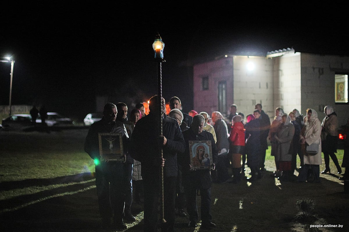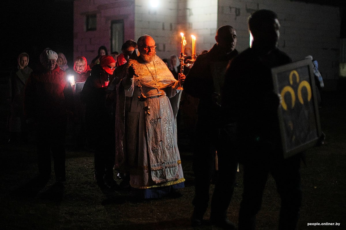 Около полуночи верующие с зажженными свечами выходят из храма и совершают крестный ход — торжественное шествие вокруг церкви под звон колоколов.