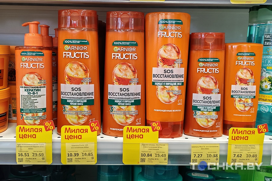 Шампунь Fructis «SOS Восстановление» пять лет назад стоил 8,09 рубля, аналогичный бальзам – столько же. Сегодня эти продукты с 30%-ной скидкой стоят 10,84 рубля, а без акции – 15,49 рубля.