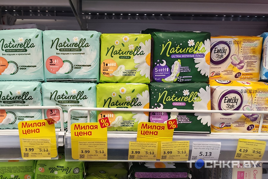 Прокладки Naturella подорожали почти в два раза: с 2,99 до 5,13 рубля (по акции – 3,99 рубля).