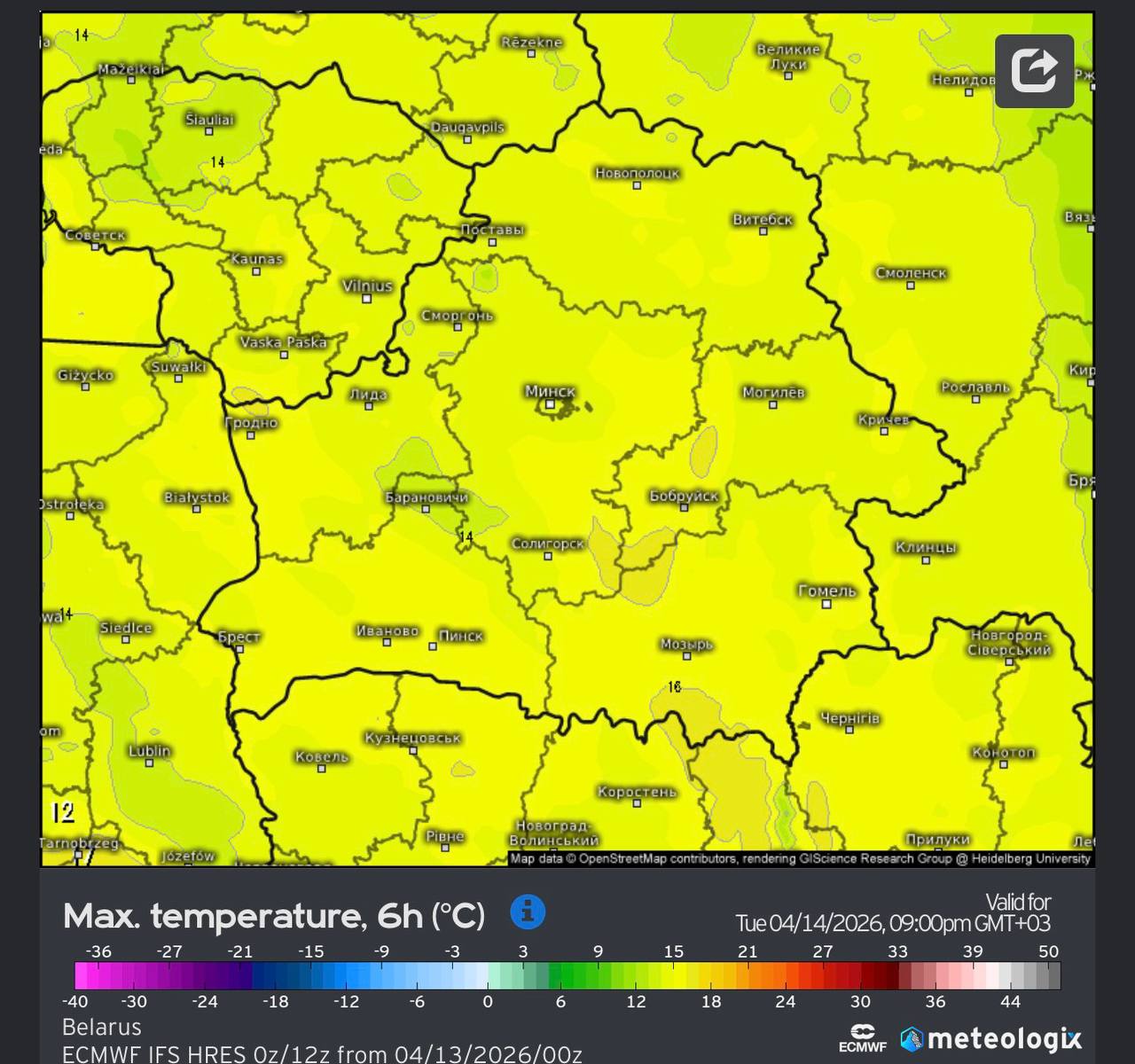 К слову, «Метеовайб» более оптимистичен по поводу тепла в среду. Там прогнозируют максимум на +19°С.