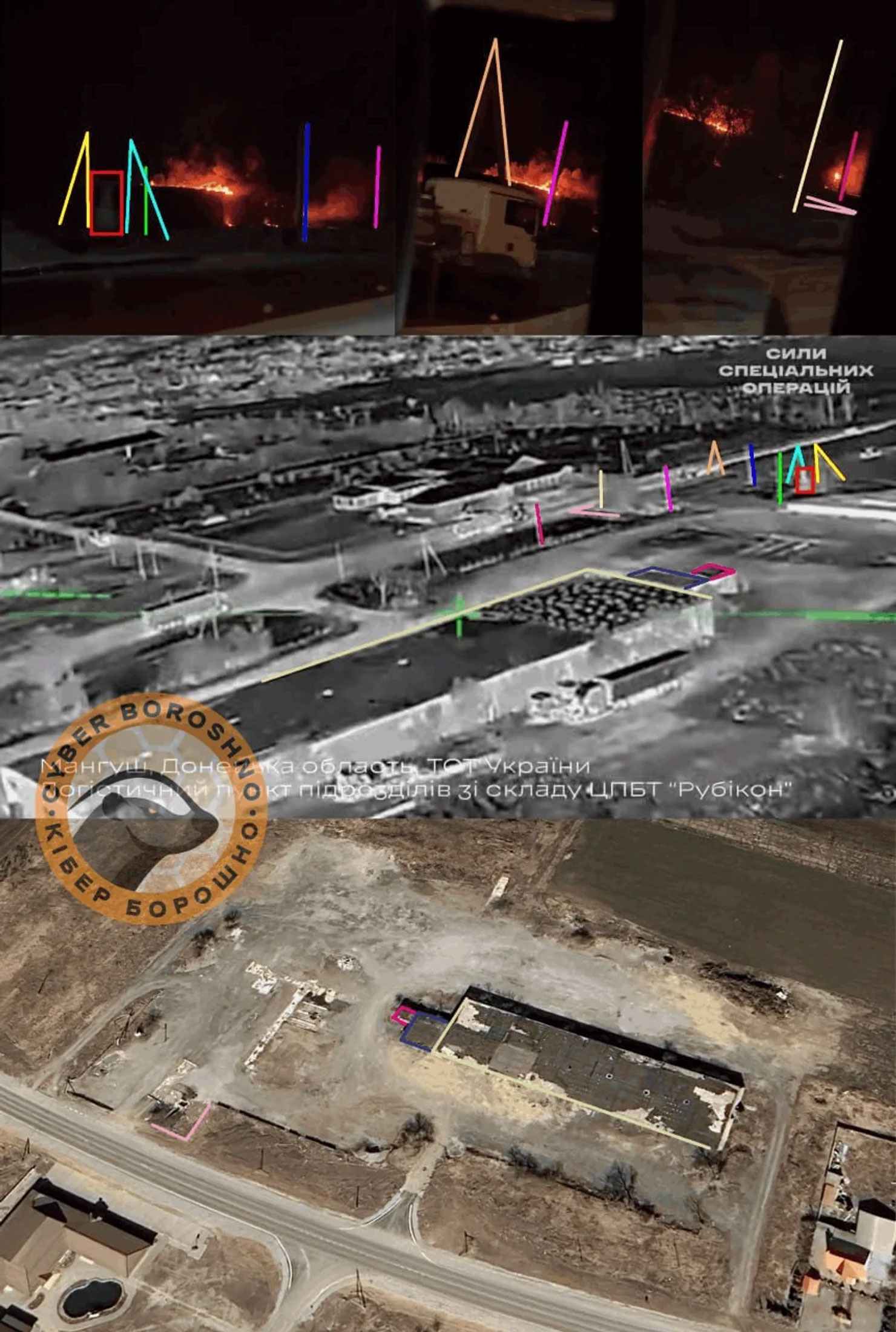 OSINTеры «КиберБорошна» привели данные объективного контроля удара по базе «Рубикон», сделанном на основе видео ССО и видео из-под Мангуша, которые появились в сети. В итоге установили координаты точки попаданий и масштабы поражения.