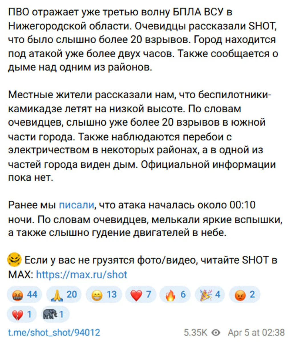 В ночь на 5 апреля беспилотники атаковали Нижегородскую область России, где после серии взрывов поднялся пожар в промышленной зоне. Также зафиксированы перебои с электричеством.