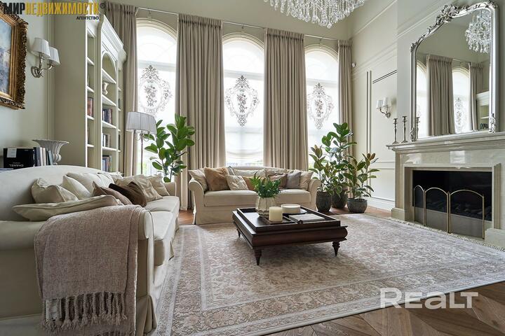 Интерьер выполнен в классическом стиле: светлая мебель, декоративные панели на стенах, крупные люстры, текстиль в спокойных оттенках, камин, большие окна и высокие потолки.
